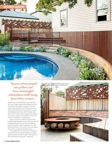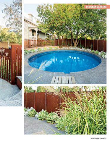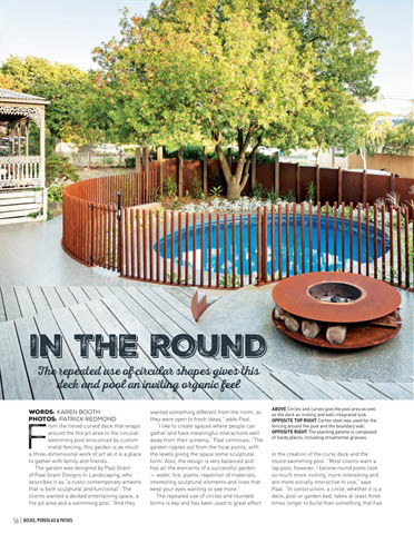 The Hawthorn Corten-Framed Circular Pool Garden was featured in Backyard Decks, Pergolas & Patios Magazine (July 2017), recognised for its bold use of form and repetition. The circular pool sets the foundation for the entire design, with curves and geometry carried consistently through the layout to create a cohesive and inviting outdoor space.