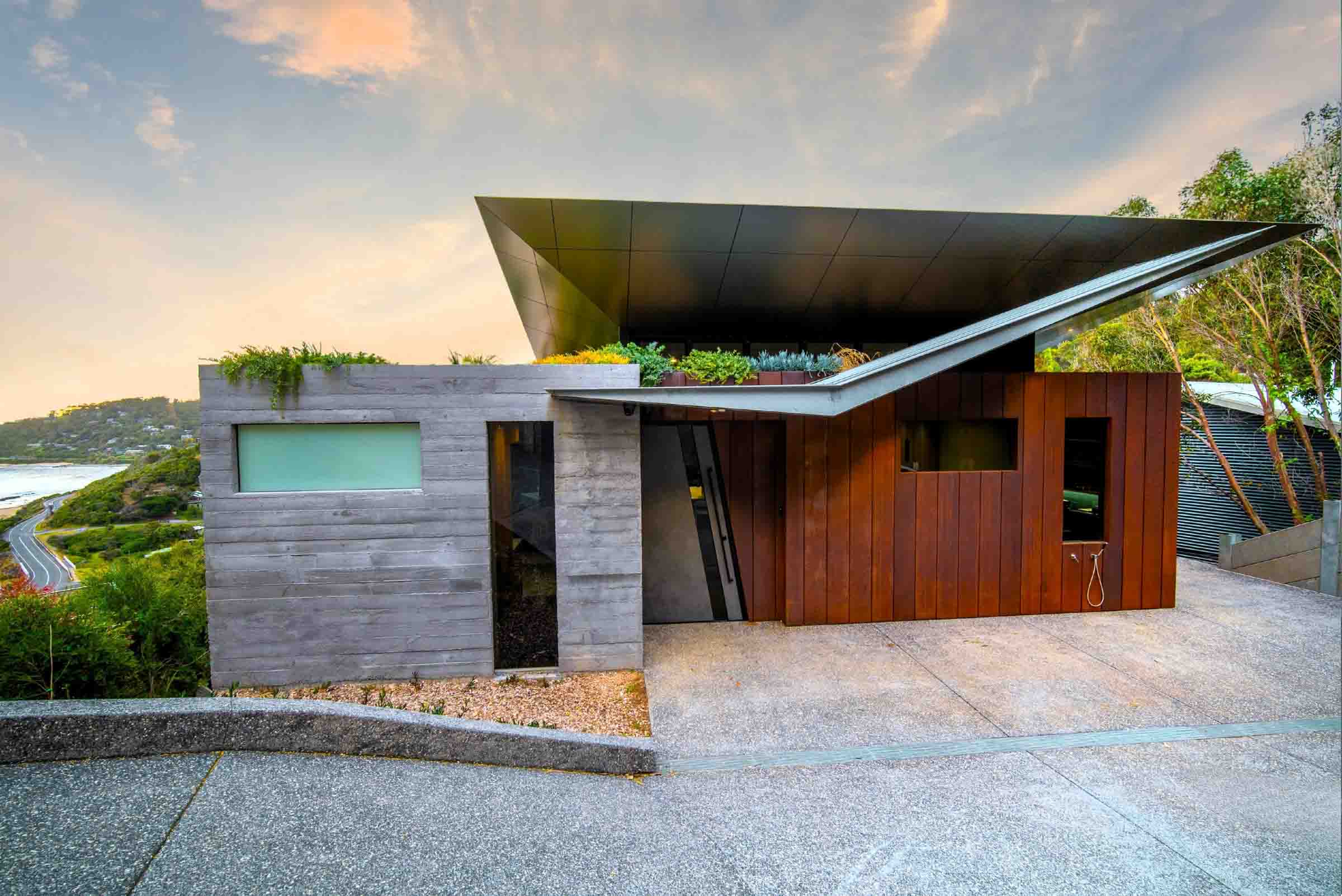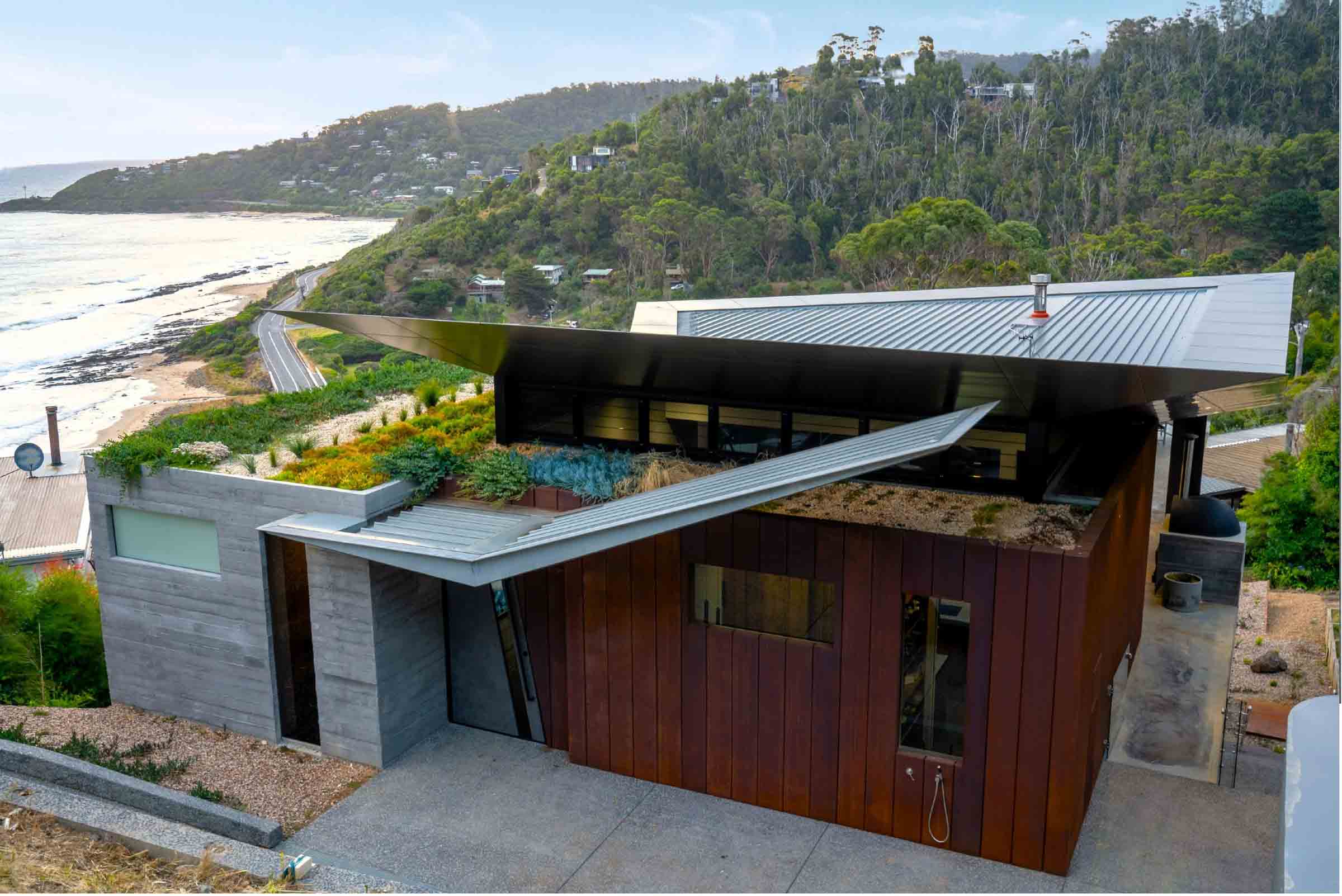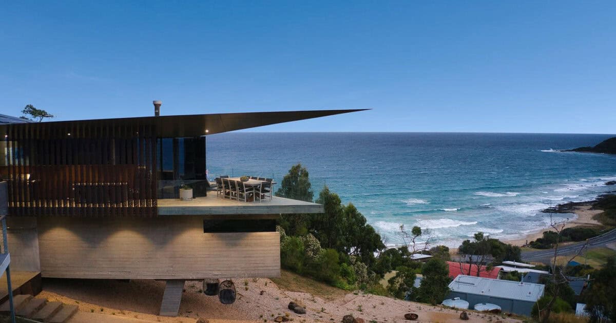 Perched within coastal scrub above the Southern Ocean, Horizon does both. Expansive views stretch across bushland to open water, uninterrupted and raw. The landscape needed to honour that. Not compete with it.