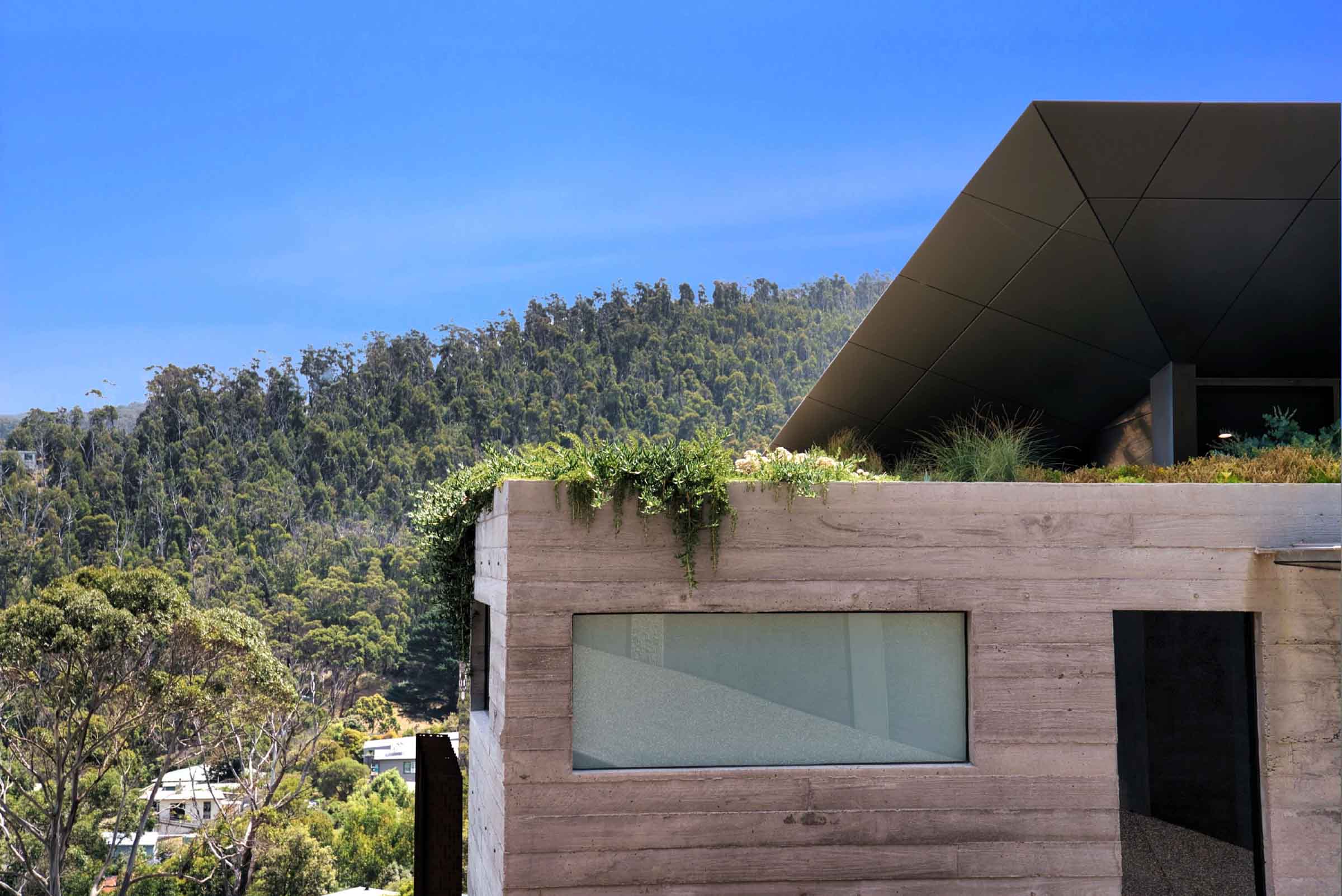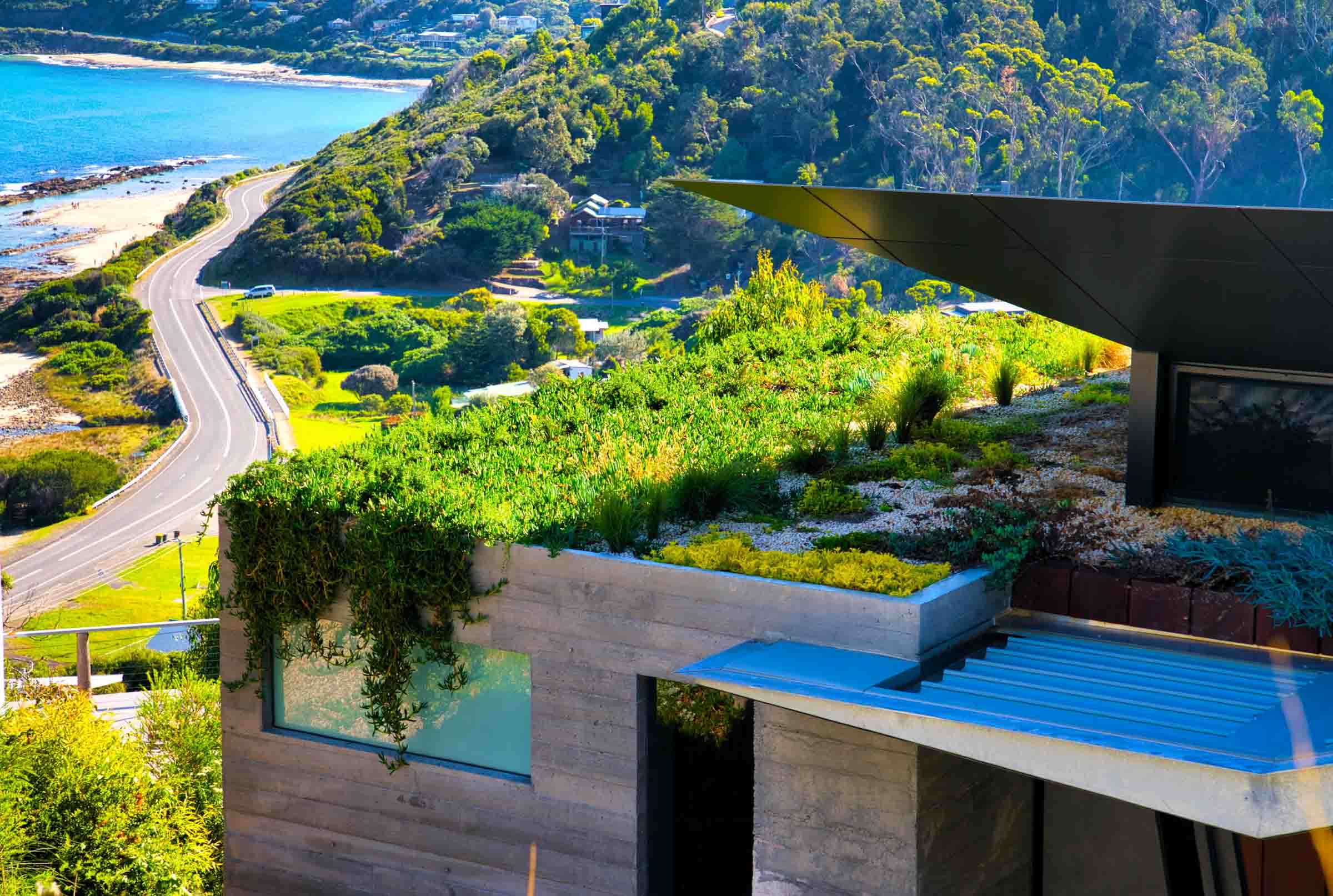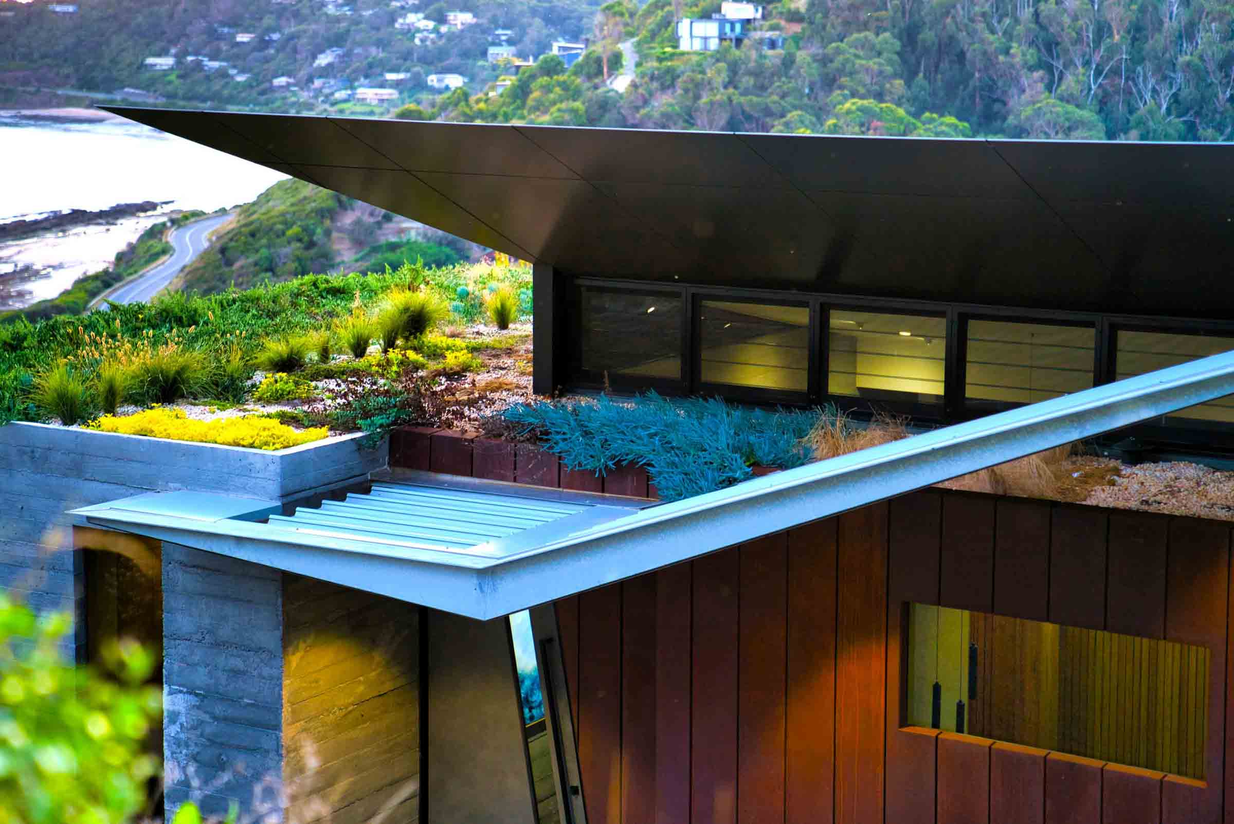 Because of the site’s flame zone rating, the rooftop could not become a traditional garden. Instead, a considered green roof of native grasses and resilient succulents was installed across the cantilevered form. It softens the architecture when viewed from above and strengthens thermal performance. Practical. Beautiful. Necessary.