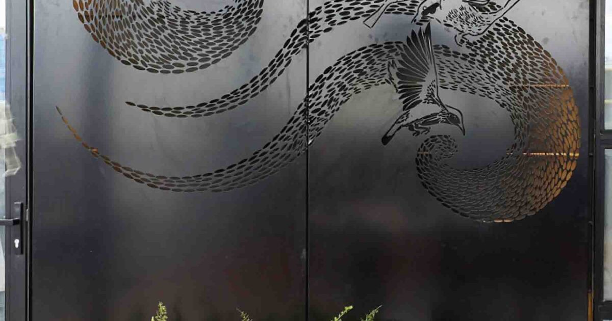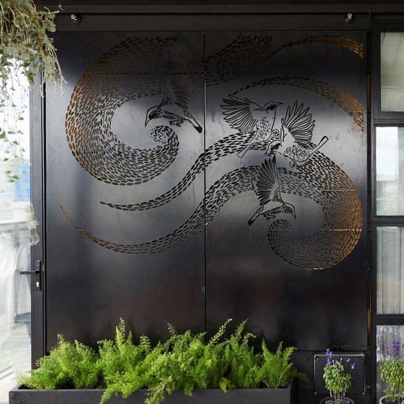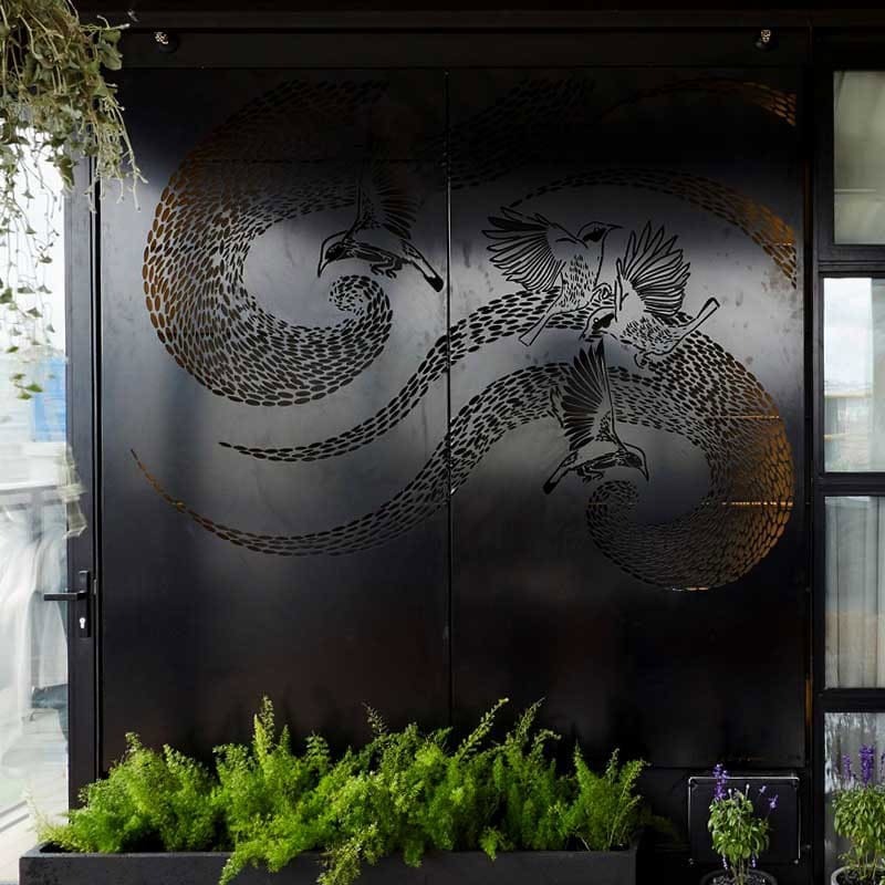 Depicting the dynamic flight of the Australian Wattle Bird, the piece translates fine art into architectural form, balancing movement, shadow, and precision. Laser-cut locally in Melbourne from black powder-coated aluminium, the screen delivers crisp detailing and long-term durability suited to Australian conditions.