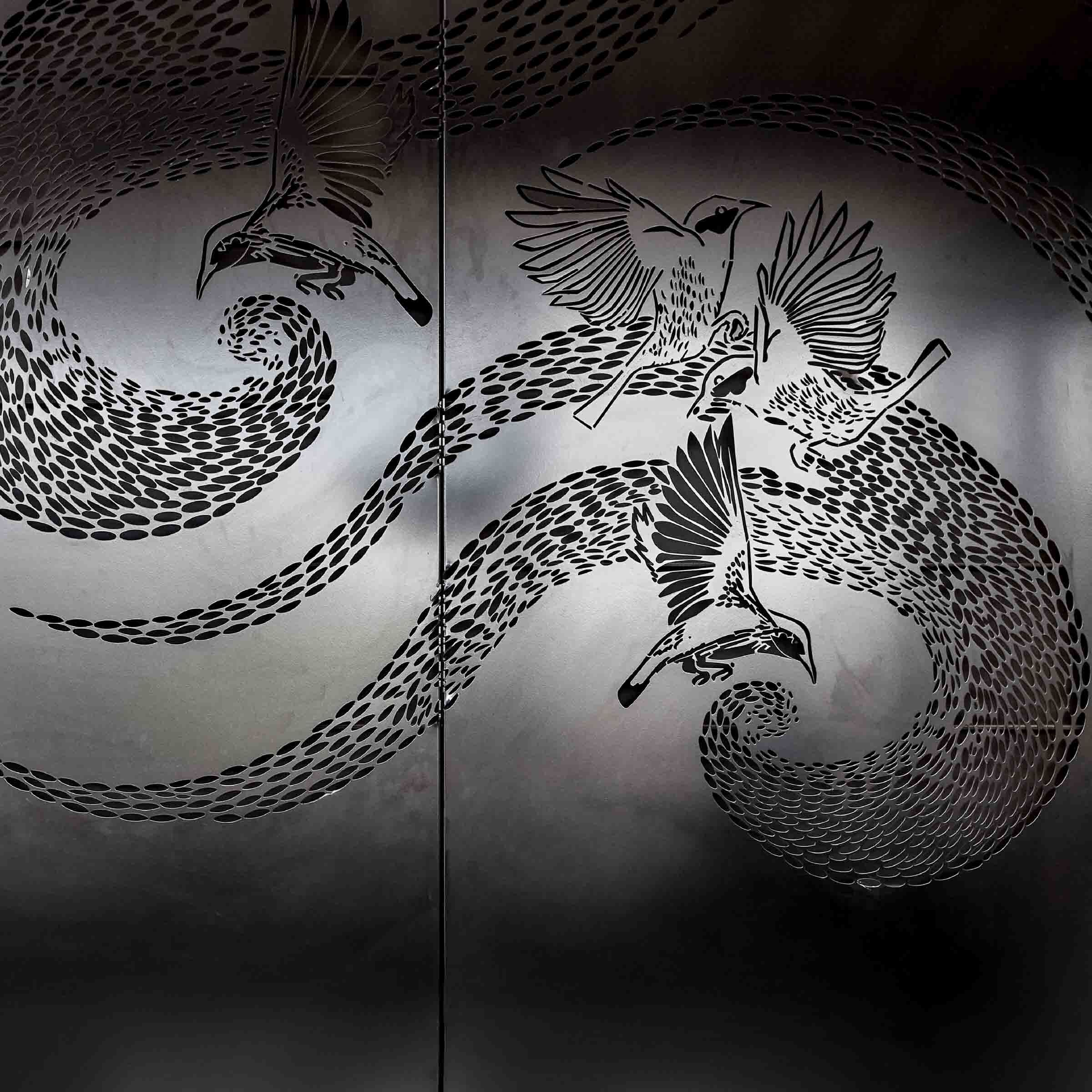 A limited-edition sculptural art screen featured on The Block 2018, laser-cut in Melbourne and designed to cast dramatic light and shadow while celebrating the flight of the Australian Wattle Bird.